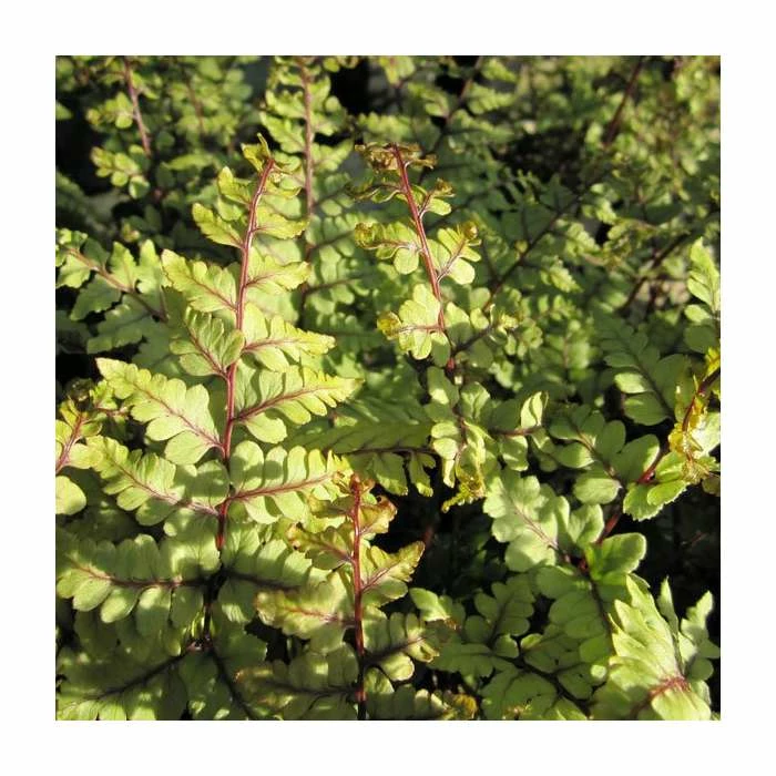 Athyrium otophorum okanum is a deciduous fern with arching yellow-green fronds that have reddish purple midribs and two rounded pinnae. It is ideal for beds and borders, or as a marginal plant for ponds and bogs.