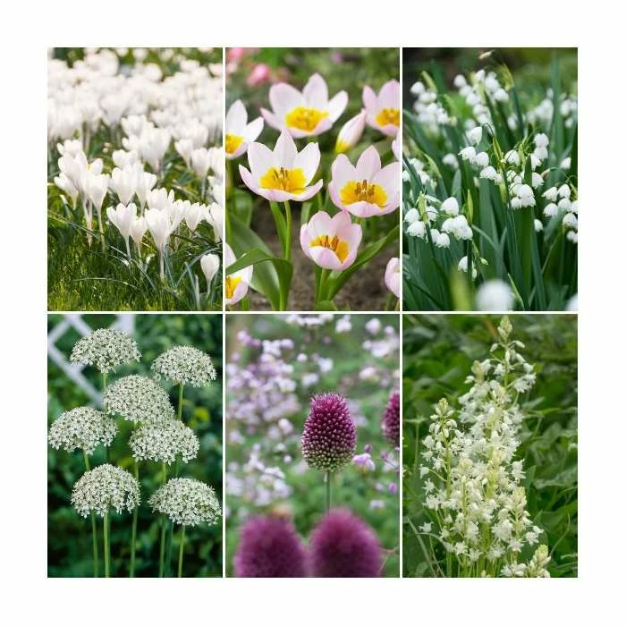 A carefully thought through collection of flowering bulbs, gifting you with a pink and white flowering display…